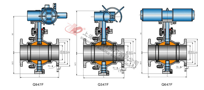 4、Q647F、Q647Y、Q647H氣動固定球閥主要根據剖面、長度、高度、外形等作出說明。