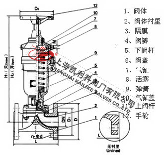 6、閥體與蓋被中間隔膜隔開,使得隔膜上方的閥蓋,閥桿等零件不受介質侵蝕。