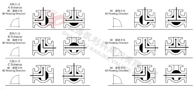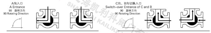 電動三通球閥分L型和T型,介質流通方向見下圖。L型電動三通球閥適用于介質流向的切換,能使相互垂直的兩個通道連通:T型電動三通球閥適用于介質的分流、合流或流向 切換,T型孔道可以使三個通道互相連通或使其中兩個通道連通,電動三通球閥一般采用三個閥座結構,亦可根據用戶要求采用四閥座結構。