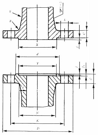 法蘭外徑D系列1/系列2 螺栓孔中心圓直徑K 螺栓孔直徑L系列1/系列2 雙頭螺柱 d X系列1/系列2 Y系列1/ 系列2 f f1、f2 Nmax Smax R