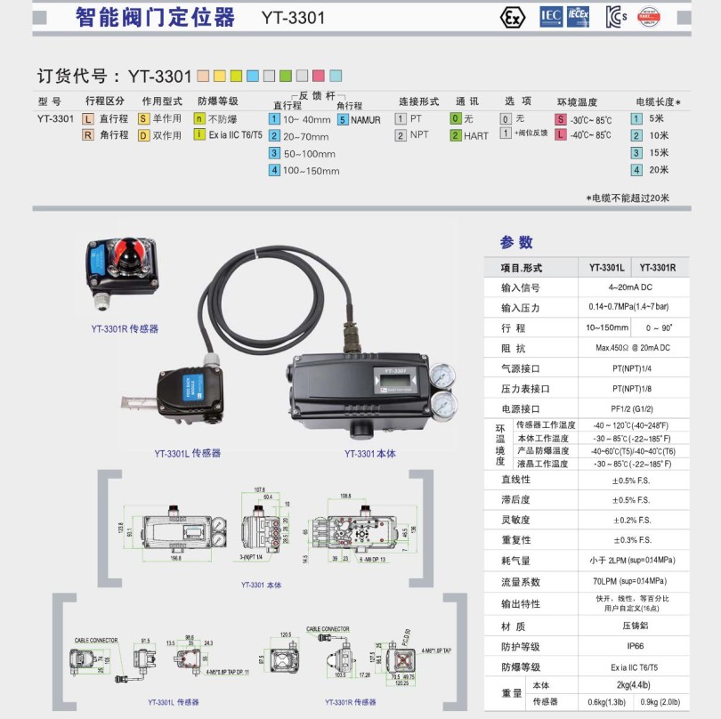 智能閥門定位器YT3301系列是通過接收控制器或控制系統發出的4~20mA 電流信號來控制閥門開關的裝置。
