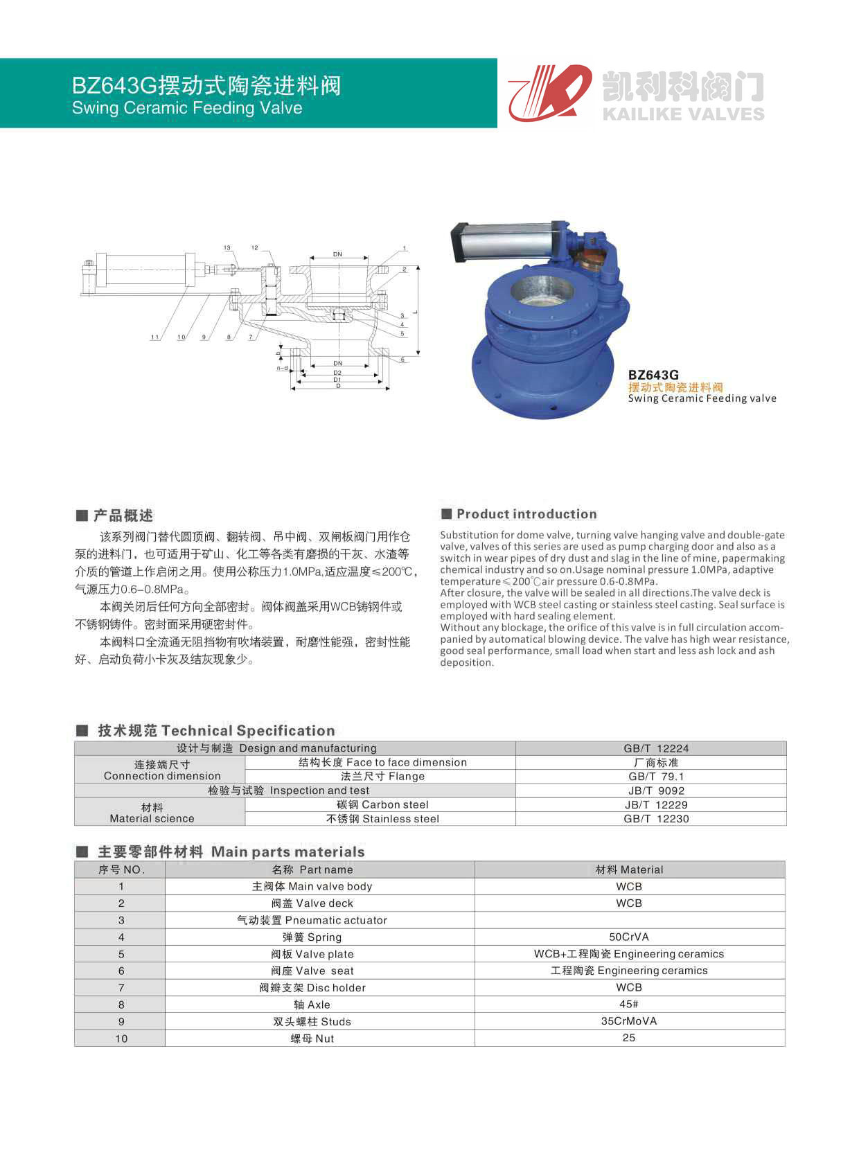 2、BZ643G擺動式陶瓷進料閥在關閉后任何方向全部密封。閥體閥蓋采用WCB鑄鋼件或不銹鋼鑄件。密封面采用硬密封件。